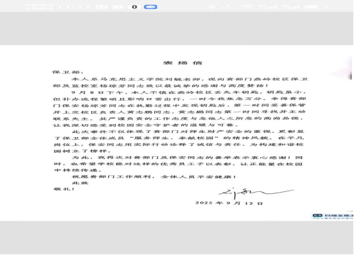 燕岭校区消防交通科始终秉持“以师生需求为工作导向”的理念,将满足师生实际需求作为各项工作的出发点与落脚点。在服务实践中,该科室聚焦紧急求助的及时响应、失物招领的精准高效、安全科普的全面深入三个关键维度,精心打造并持续优化服务流程,致力于为师生提供兼具人文温度与执行效率的优质服务。凭借出色的工作表现,该科室近期累计收获师生书面感谢3次、口头称赞20余次,赢得了广大师生的高度认可与信赖。