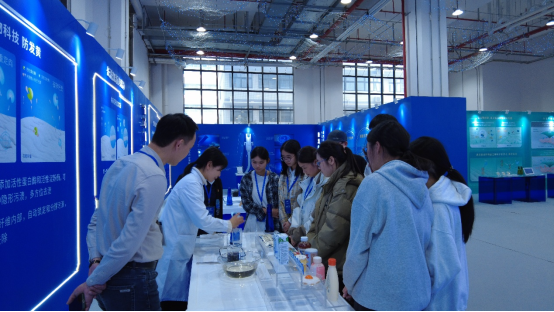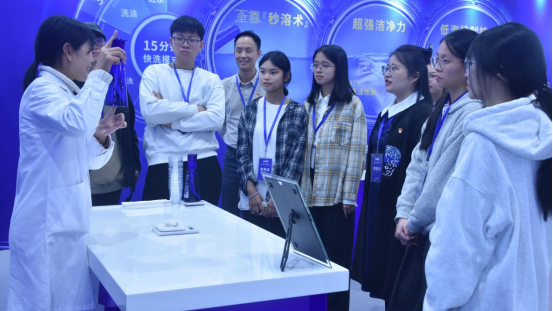 抵达现场后,蓝月亮工作人员热情接待了来访的师生。在讲解环节,工作人员化身专业讲师,详细介绍了蓝月亮各类产品的独特用法,从日常衣物清洁到特殊污渍处理,每款产品的精妙之处都被细致解读,同学们对洗涤产品背后的科学原理有了全新认识。大家专注聆听,不时就感兴趣的问题踊跃提问、积极交流。