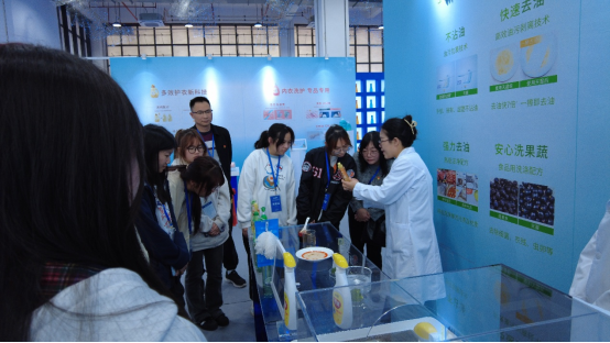 精彩的实验演示环节更是将现场气氛推向高潮,工作人员运用蓝月亮产品,现场演示针对不同材质衣物、不同顽固污渍的清洁过程,如油渍斑斑的厨房抹布、汗渍泛黄的棉质衬衫等,只见在简单的浸泡、揉搓后,原本难以去除的污渍迅速瓦解,衣物恢复洁净如初,神奇的去污效果令同学们惊叹不已。