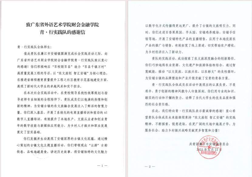 安铺镇政府在感谢信中指出,广外艺青·行实践队积极响应“百千万工程”和“双百行动”号召,深入乡镇基层,发挥数字技术和青年智慧,在农产品电商推广、新农人培训、非遗文化传播等方面成效显著,有效提升了本地农户、文旅从业者和创业青年的数字技能与新媒体应用能力,为乡村人才振兴和职业发展奠定了坚实基础。