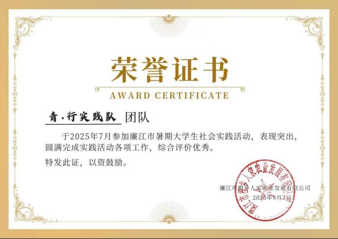 近日,财会金融学院青·行实践队在圆满完成2025“双百行动”暑期社会实践后,收到来自湛江廉江市安铺镇人民政府的感谢信与廉江市橙乡人家农业发展有限公司颁发的“荣誉证书”企业代表校内“双百基地”现场举行锦旗授予仪式,感谢师生团队在助推地方乡村振兴中的积极贡献和突出成效。