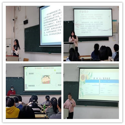 在社员们的期盼下,交流会拉开了序幕。首先,主持人宣布开始“击鼓传书”热身游戏。伴随着欢快的音乐声,大家围成圈,音乐一停,手中拿到书的同学或表演才艺,或分享好书。在欢声笑语中,游戏拉近了心与心的距离,还给小伙伴们提供了展现自我的机会。紧接着,好书分享环节开始,各部门代表相继上台,带我们遨游书海,与书相会,倾听书中的故事。代表们通过作者、作品简介、读书心得等内容对所推荐的书进行了精彩讲解,分享了对图书的理解和阅读感悟,将自己喜爱的好书推荐给其他社员,最后还贴心地附上了该书的检索方式和馆藏地点。“好书推荐”不仅让社员们体会到分享的快乐,还锻炼了演讲能力和胆量。