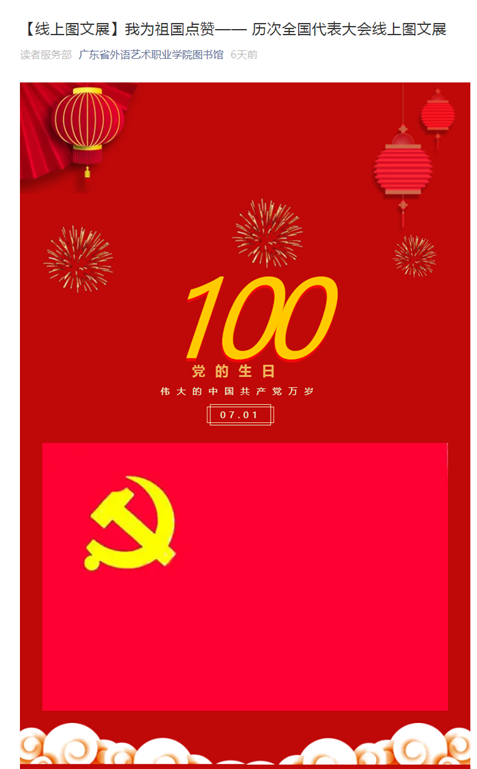 “我为祖国点赞--历次全国代表大会线上图文展”选取了中国共产党历次全国代表大会的图文,通过线上展览的方式展现了中国共产党团结带领中国人民众志成城、克服挑战,坚定向宏伟目标奋进的历史进程。“线上图文展”通过图书馆官方微信公众号和图书馆官方网站同时进行推送。