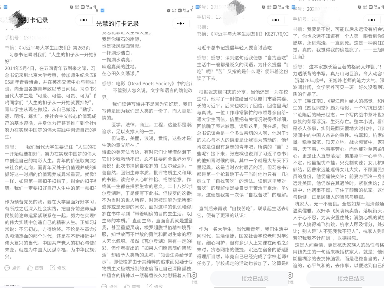 阅读滋养心灵,读书打卡活动不仅丰富了同学们的个人涵养,强化自身修养,使自己的精神世界变得更为丰富多彩,而且激发同学们积极地阅读书籍、了解书籍,主动地思考并领悟书籍的其中蕴意,让“沉淀”的图书“流动”起来,将书中精华传承下去。参与此次活动让同学们收获颇深又感慨良多,有同学表示:“读万卷书,行万里路。通过阅读各种各样的书籍,扩展了我的认知,我从阅读中阅见世界。”也有同学表示“通过此次活动,我养成了阅读的习惯,我喜欢上了阅读,不再像从前囫囵吞枣,而是细细品尝书中字里行间所蕴含的文化和道理。”