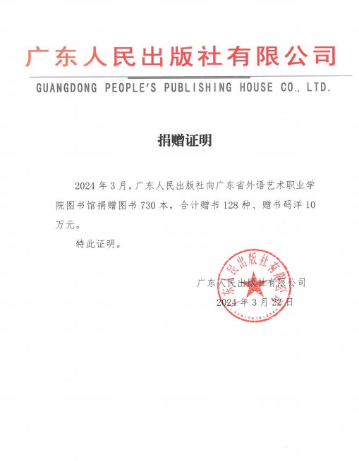 近日,广东人民出版社向我校图书馆捐赠新书730本,码洋价值10万元,种类涵盖哲学、经济、文化、科学、教育、文学、艺术、历史、工业技术等多个类目,内容丰富,质量上乘,与我校专业的契合度较高,丰富了我校图书馆馆藏。