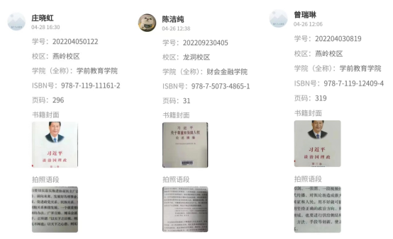 活动自4月22日启动以来,受到了同学们的热烈响应。活动期间,同学们积极借阅相关经典书籍,选取习近平总书记重要讲话、文章中最有感触的语段,连续7天拍照打卡。本次活动共有872名学生参与,其中有685人成功打卡,累计打卡次数高达5409次,活动最终评选出最佳幸运奖、最佳鼓励奖、最佳参与奖共15名。