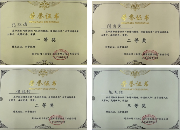 本次活动我校共有111名学生参赛,有效参赛作品106个,其中餐饮旅游学院2023级烹饪工艺与营养专业纪欣炀同学的作品“潮汕话读《蒹葭》”获得一等奖,公共管理与服务学院2023级智慧健康养老服务与管理专业周清秀同学的作品“客家话《山行》”与餐饮旅游学院2023级烹饪工艺与营新专业何佳铃同学的作品“潮汕话+《清明》”获得二等奖,公共管理与服务学院2022级人力资源管理专业陈东汝同学的作品“潮汕话读+《行路难(其一)》”获得三等奖。