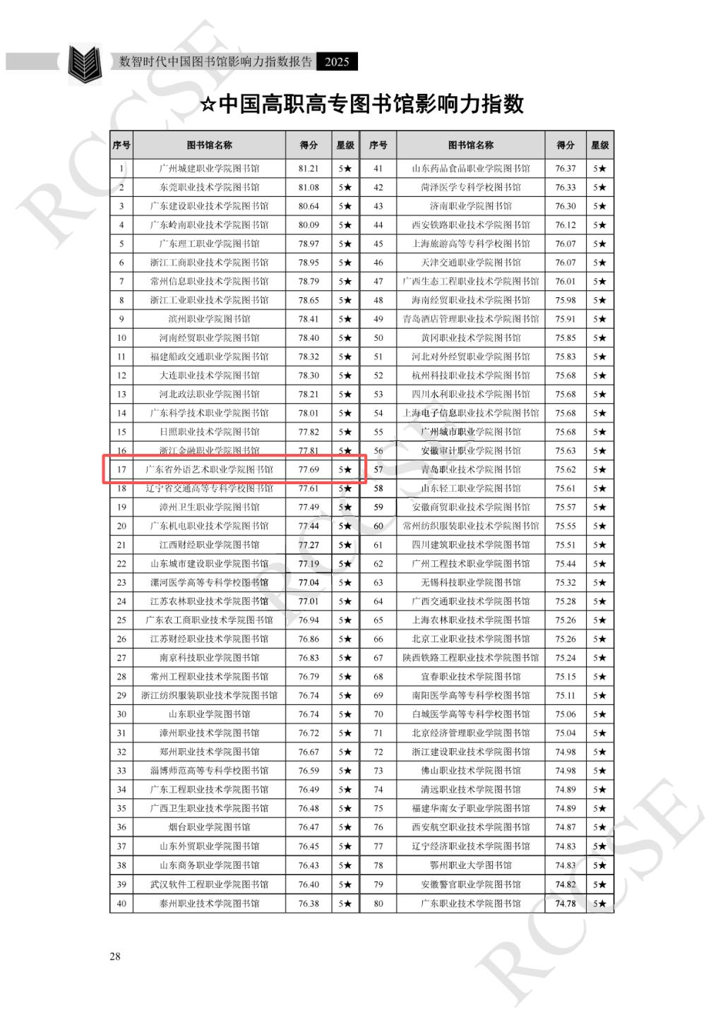 近日,武汉大学中国科学评价研究中心、数字出版智能服务技术教育部工程研究中心联合发布《数智时代中国图书馆影响力指数报告(2025)》。我校图书馆在全国1554所高职高专院校图书馆影响力总排行榜中跃居全国第17名(较2024年提升20名),位列广东省内第7名(较2024年提升3名),并荣获5★评级(5★代表具有突出影响力的单位,位居全国同类图书馆前10%),这一成绩充分彰显了我校图书馆在数智化转型与服务创新方面的综合实力。