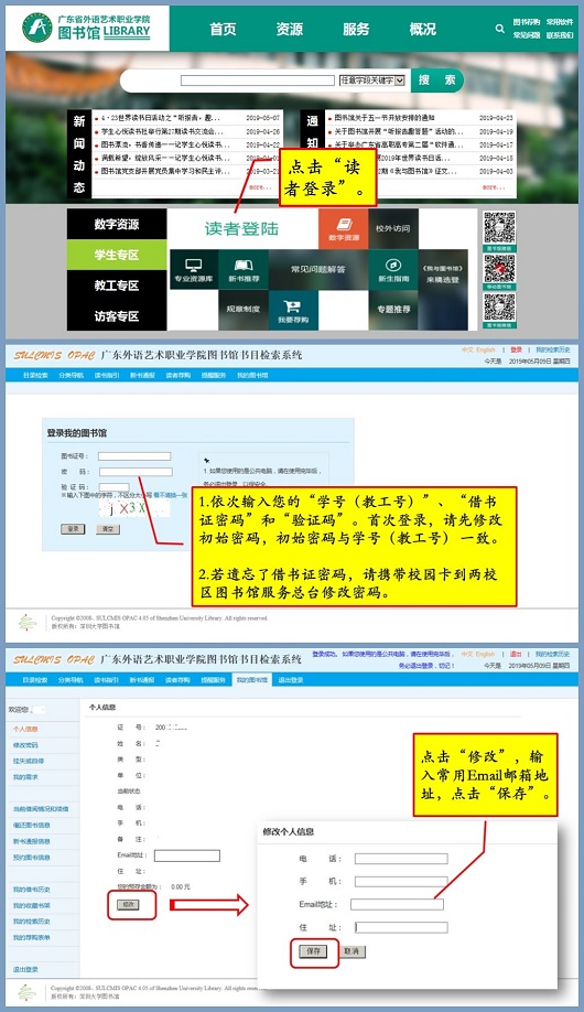 图书馆近期在给读者发送预约书到馆提醒时,发现有部分读者在“个人图书馆”中登记的电子邮箱已停止服务,无法正常接收图书馆业务系统发送的提醒。因此,请各位读者及时将您在“个人图书馆”中登记的Email地址修改为常用电子邮箱,以便及时接收图书馆发送的预约书到馆提醒、荐购采纳答复、荐购书到馆通知和催还书提醒等。具体修改方式请见附件。