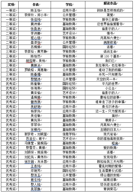 第八届“寻找最爱读书的你——邀你一起解读图书”大赛共收到来自全校7个二级学院的投稿共149件。经过几轮评审,共评出一等奖作品3件,二等奖作品5件,三等奖作品7件,优秀奖作品25件。现将获奖作者及作品名单公布如下: