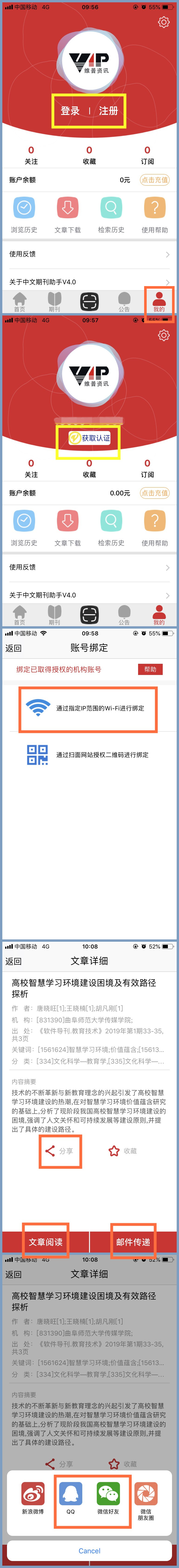 在手机软件商店中搜索下载“中文期刊助手”。在校内(需要连接学校WIFI)注册登录后,获取认证绑定帐号,即可在校外用手机阅读期刊全文,也可以将文章发送到电脑中进行阅览和编辑(如附件图4所示)。