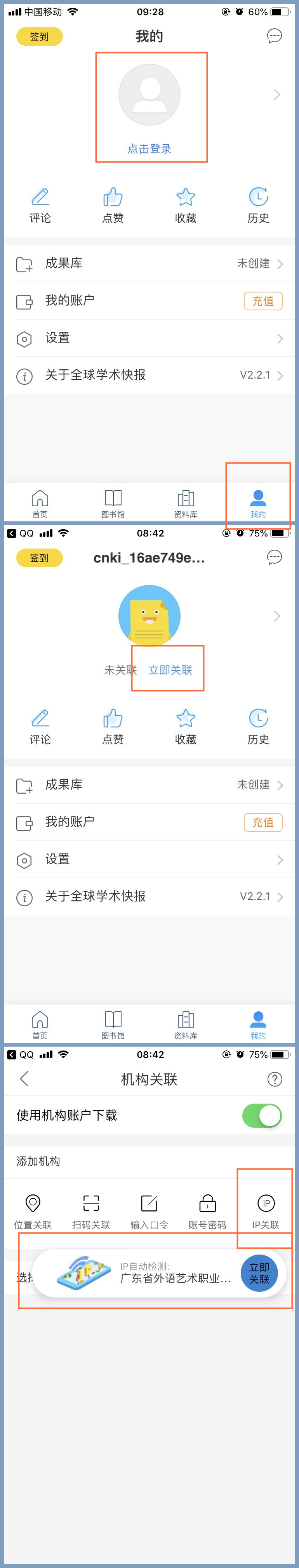 在手机软件商店中搜索下载“全球学术快报”。在校内(需要连接学校WIFI)注册登录后,依次点击“我的”→“立即关联”→“IP关联”(如附件图1所示)。关联成功后,即可在校外用手机阅读期刊全文,也可将文章发送到电脑中进行阅览和编辑(如附件图2所示)。