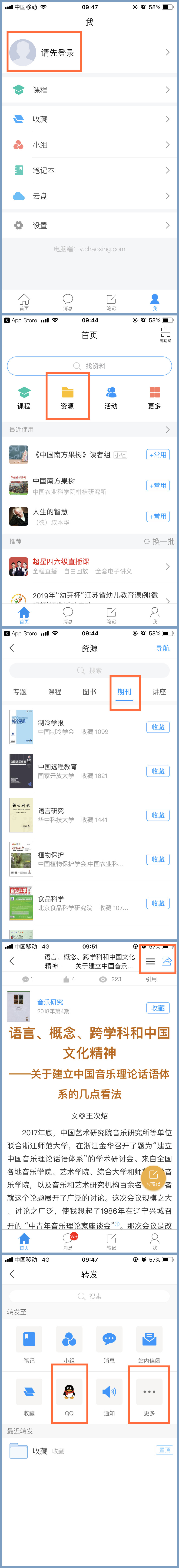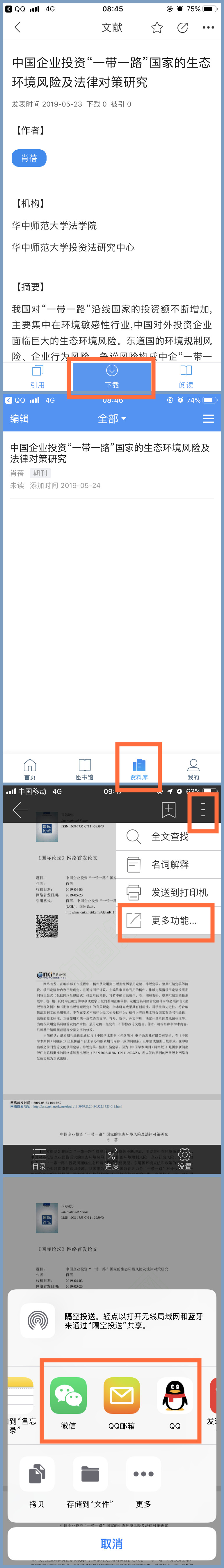 在手机软件商店中搜索下载“超星学习通”。在校内(需要连接学校WIFI)注册登录后,即可在校外用手机阅读期刊全文,也可以将文章发送到电脑中进行阅览和编辑(如附件图3所示)。
