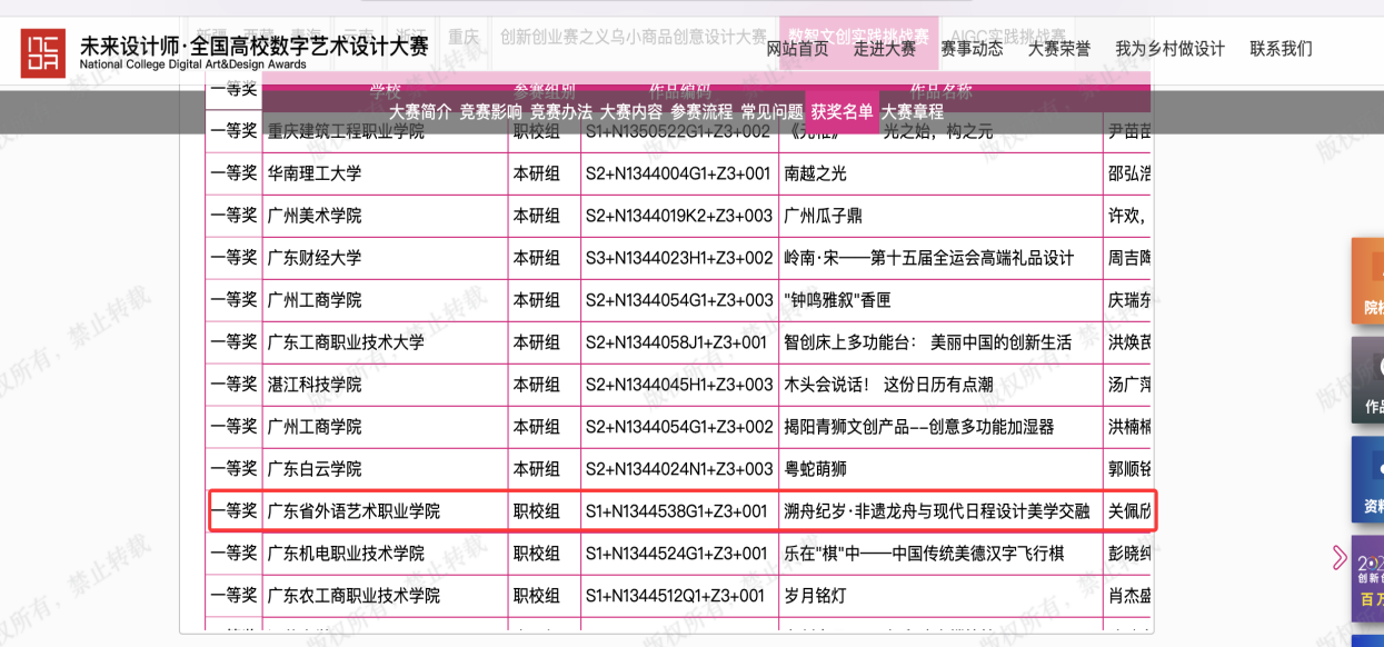 近日,第13届未来设计师・全国高校数字艺术设计大赛(NCDA)产教融合赛道数智文创实践挑战赛(广东选拔赛)落下帷幕。我校数字创意学院学生关佩欣、柳瑾妍、叶茂盛(指导老师:杨赛男、罗翊夏)团队凭借扎实的专业功底与充足的创意设计在众多参赛选手(作品)中脱颖而出,最终荣获职校组省级一等奖。