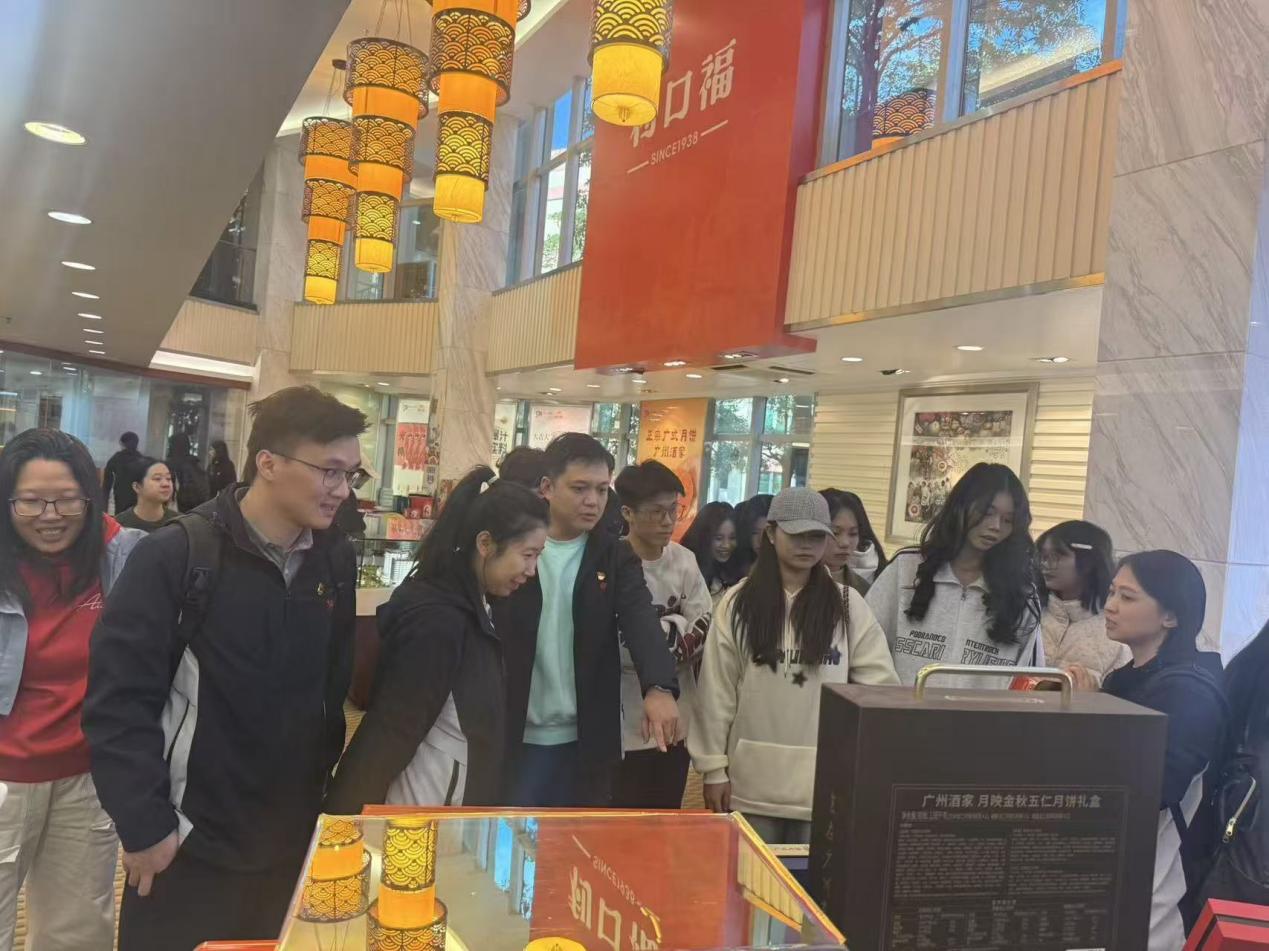 在利口福公司工作人员的精心安排下,师生们分为A、B两组,交替进行参观与学习。在非遗文化展厅,同学们循着历史的脉络,深入了解广州酒家深厚的企业文化和月饼等产品的非遗制作技艺传承,深刻感悟到老字号品牌历久弥新的匠心精神与创新活力。