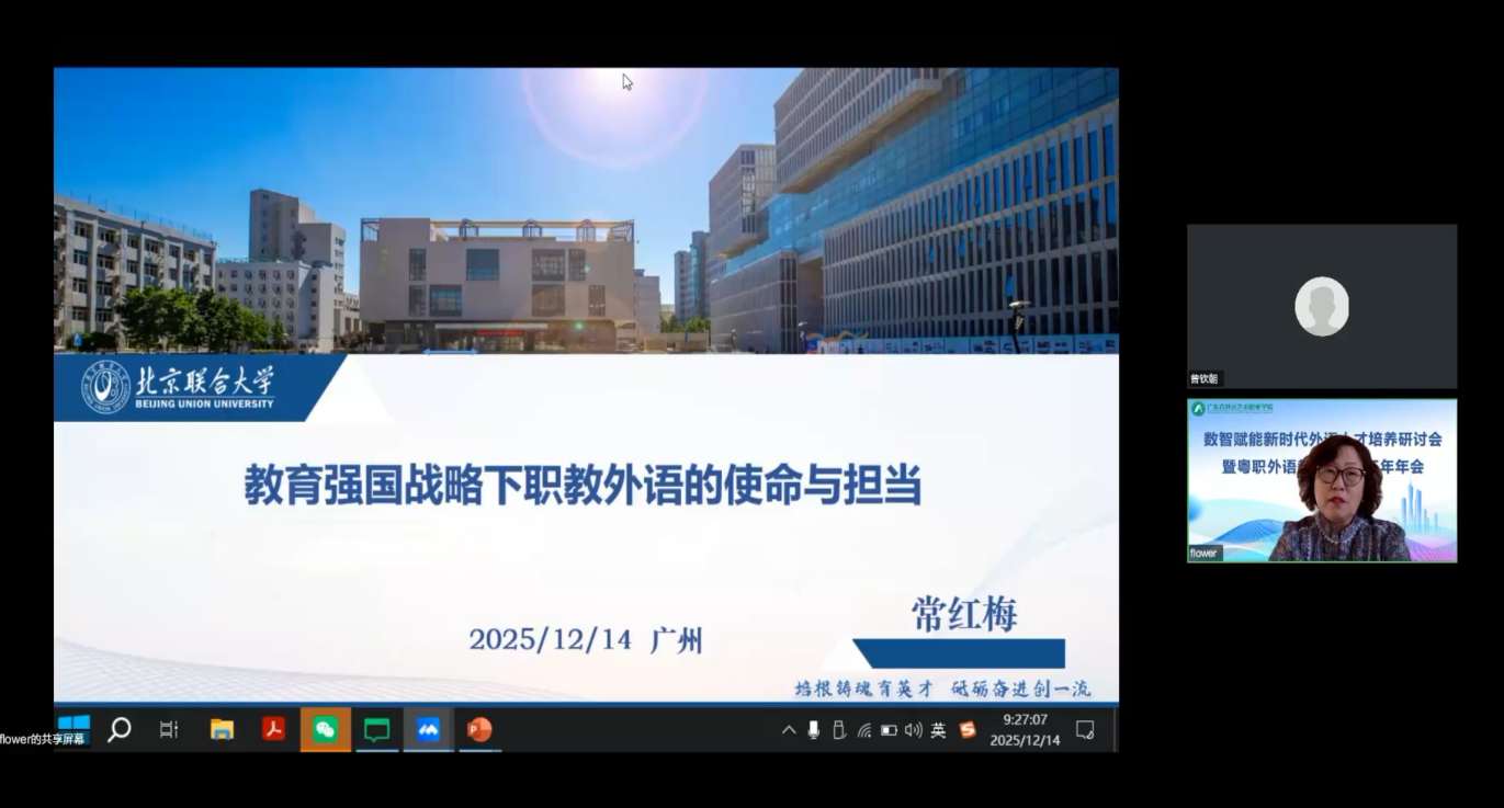 12月14日,由粤职外语教指委主办、我校承办的数智赋能新时代外语人才培养研讨会暨粤职外语教指委2025年年会在我校五山校区举行。会议聚焦教育强国战略下职教外语的使命担当,围绕智能技术与外语教学融合、产教协同育人等关键议题展开深入研讨,为广东省职业学校外语教育高质量发展搭建了交流合作的高端平台。学校副校长袁洪教授、粤职外语教指委委员、全省各职业院校外语院系负责人、行业企业专家及骨干教师等近180人参加会议。