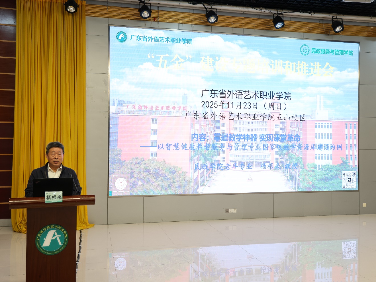专题培训环节,广东文艺职业学院戴丹副教授以《品牌包装策划与项目实训》为例,分享新形态活页式教材建设经验;广州职业技术大学教务处长周晖教授围绕“校企双元、数字赋能”,详解“五金”建设的实践路径;外研社陈苑、高教社林群生分别从数字教材研发、精品在线开放课程建设提供专业指导。四位校外专家的报告紧扣职教改革趋势,为我校“五金”建设注入了新动能。