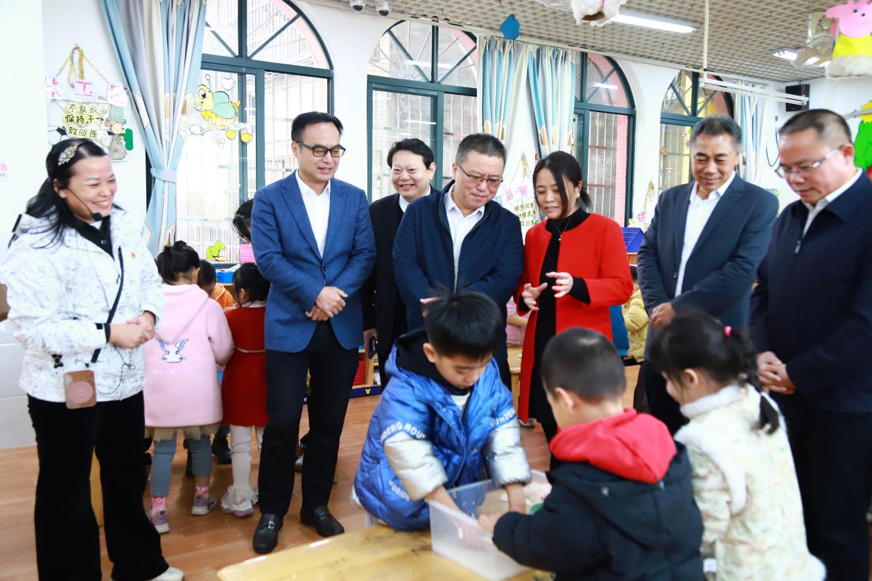 在廉江市委书记曾平治、市委副书记陶加辉、市教育局局长吴廷武的陪同下,调研组深入廉江第五幼儿园即第一幼儿园教育集团第五园区观看集团办学成果展示、观摩幼儿科学活动,深入了解集团在托幼一体化建设、特色课程开发等方面的创新成果。在听取学前教育学院副院长、廉江市第一幼儿园教育集团党总支书记郑娜关于教育集团“精准调研破局、政校园联动聚力、分层培育赋能、教研创新提质”核心工作进展情况的汇报后,调研组就建强幼教队伍、均衡城乡资源、凸显园所特色、打造教育标杆等共建方向,为新阶段集团办学提出了诸多指导性意见。