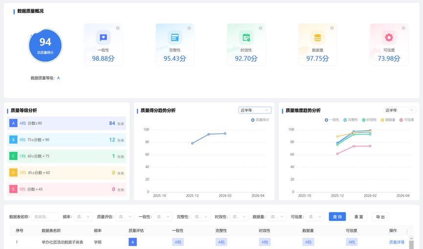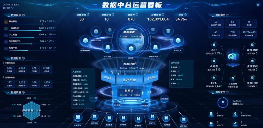 近年来,学校高度重视教育数字化转型,作为“职业院校数字校园建设试点”单位,严格遵循国家规范,建立了常态化、精准化的数据上报机制。学校聚焦数据治理核心环节,通过打通各部门数据壁垒、构建校本数据中心、制定覆盖教学、管理、服务的统一数据标准,并依托数据质量检测平台开展针对性整改,显著提升了数据的一致性、完整性与时效性,为智慧校园各类应用场景的深化提供了坚实支撑。