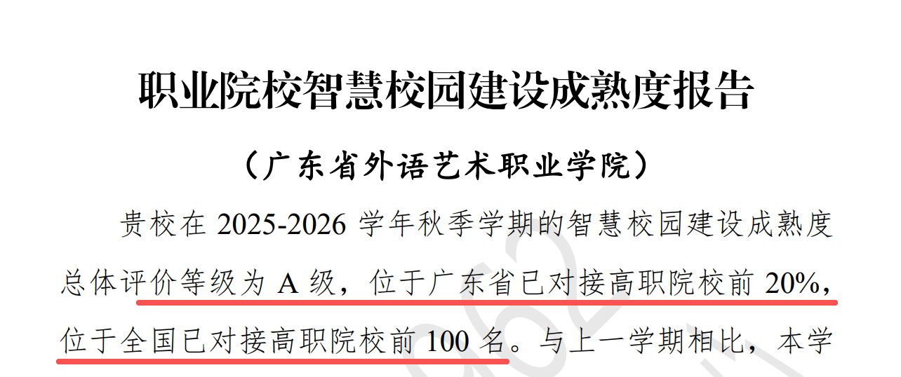 近日,教育部教育管理信息中心正式发布了2025-2026学年秋季学期职业院校智慧校园建设成熟度监测结果。我校在此次评估中表现出色,智慧校园建设成熟度总体评价再度荣获最高等级A级。自教育部此项监测体系运行以来,我校参与的全部四次评估均以最高评价通过,实现了“全A”佳绩,标志着学校智慧校园建设水平持续稳居全国职业院校第一梯队,数字化发展动能强劲。