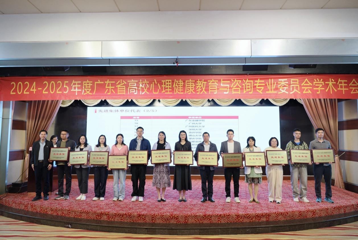 大会对全省心理健康教育与咨询工作先进集体、先进个人以及优秀论文与出版物作者进行了表彰。我校因心理健康教育工作扎实、成效显著,荣获“2024-2025年度广东省高校心理健康教育与咨询工作先进集体”称号。朱婵媚获评“2024-2025年度广东省高校心理健康教育与咨询优秀中心主任”;吴文利、刘婉娜获“广东省高校心理健康教育工作10年敬业奖”;马韵被评为“广东省高校心理健康教育与咨询工作先进个人(分管领导类)”;李倩瑜被评为“广东省高校心理健康教育与咨询工作先进个人(专兼职心理咨询老师类)”;杨雪柳被评为“广东省高校心理健康教育与咨询工作先进个人(辅导员及二级心理辅导站老师类)”。