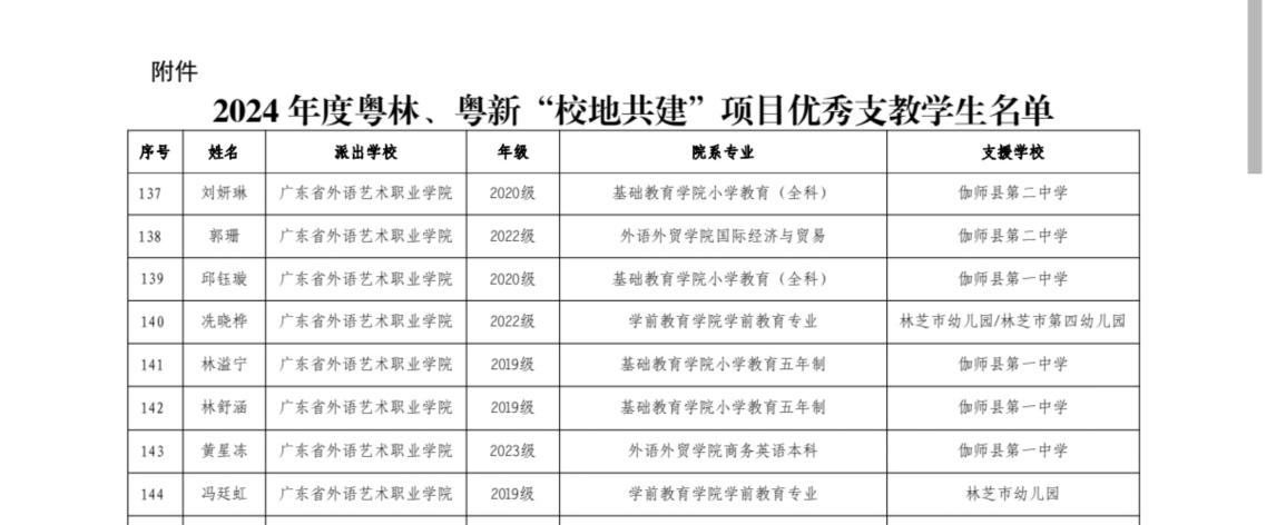 近日,广东省教育厅通报了2024年度粤林、粤新“校地共建”项目开展情况,对全省146名支教实习表现优秀的同学予以表彰,我校刘妍琳等8名支教学生表现优秀,荣获2024年度粤林、粤新“校地共建”项目优秀支教学生称号。图:我校2024年粤林、粤新“校地共建”项目优秀支教学生名单据悉,粤林、粤新“校地共建”项目是广东省教育厅主办,着眼加强民族团结、铸牢中华民族共同体意识,促进边疆地区教育发展和共建高校育人质量提升的创...