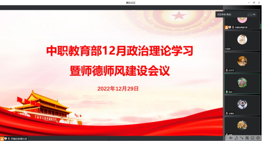 12月29日下午,中职教育部在线上组织开展12月份集中政治理论学习暨师德师风教育学习活动,继续深入开展党的二十大精神学习宣传活动,学校副校长张侃参加会议并作学习指导。中职教育部全体教职员工参加了本次学习,学习活动由中职教育部党总支副书记李雯主持。