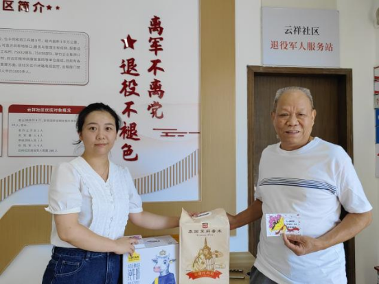 图1:社区书记为来党群服务中心的老军人送上慰问品和祝福卡
