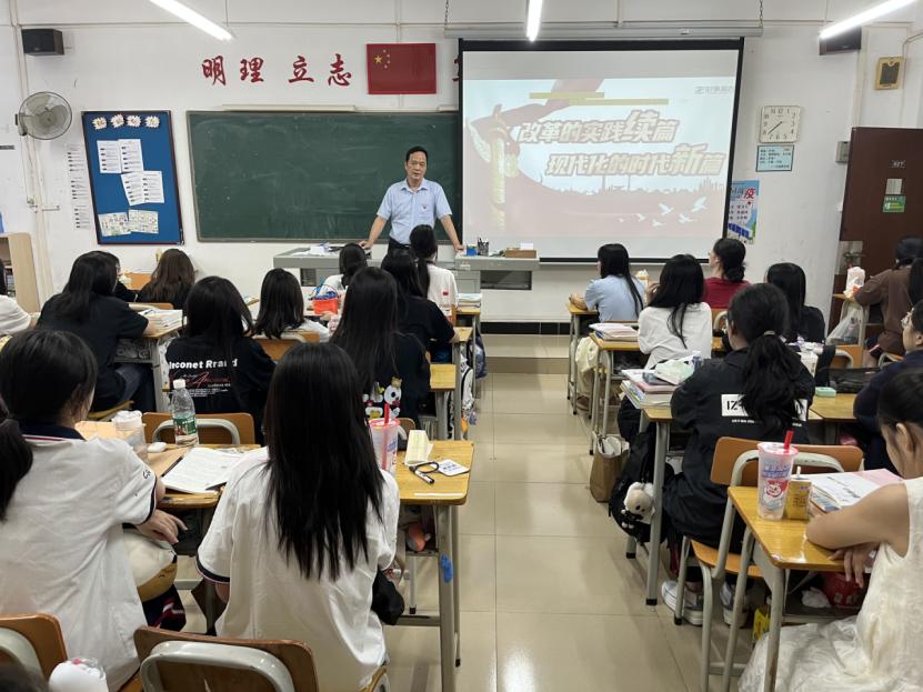 刘伟峰先以时事热点——我国运动健儿取得的出色成绩,激发同学们的民族自豪感引入第一课。在高昂的情绪和热烈的氛围下,带领同学们解读从把握历史主动,改革波澜壮阔;锚定关键领域,擘画改革蓝图;遵循改革规律,保持战略定力三方面进行了深入学习。