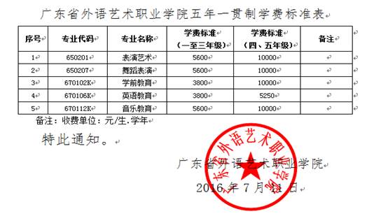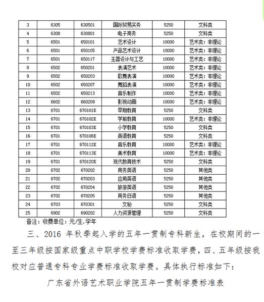 在校生的学费标准按照《关于学校调整学费标准的通知》(粤外艺职院教〔2016〕282号)规定执行。住宿费标准暂按照五山校区950元/生/学年,燕岭校区850元/生/学年,结算时学校根据广东省发展改革委的文件规定多退少补。医疗保险费每人314元,学生个人自主在学校的缴费平台缴交,学校统一划缴至广州市医疗保障局。