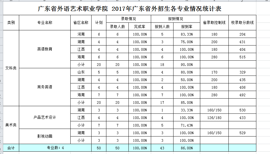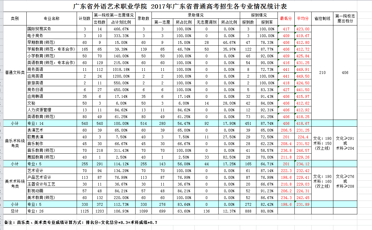广东省外语艺术职业学院2017普通高考录取情况一览表