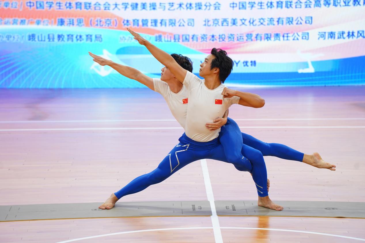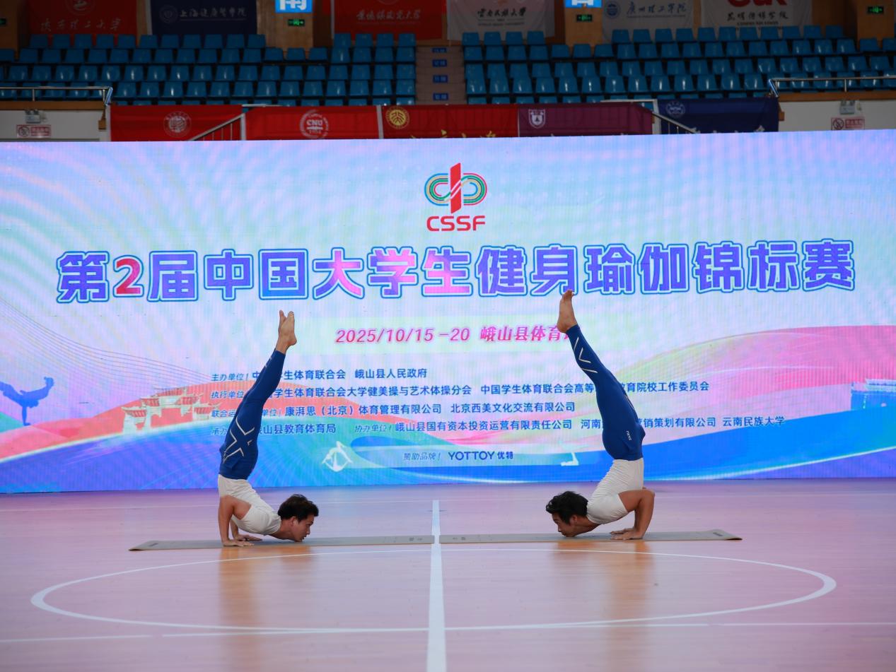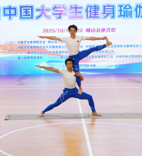 2025年10月15日至20日,由中国学生体育联合会主办的全国大学生健身瑜伽锦标赛在云南省峨山县举行。作为国内高校健身瑜伽项目中级别最高、影响力最广的竞技盛会,本届赛事汇聚了来自北京大学、首都师范大学、南京大学等全国52所高校的427名运动员同台竞技,竞争激烈,整体水平出众。学校在乙健身瑜伽队在领队林燕荣、教练员余喜娜的带领下共派出两名运动员,勇夺A组男子双人二级自选项目冠军,在全国性舞台上充分展现了卓越的技艺与昂扬的风采。