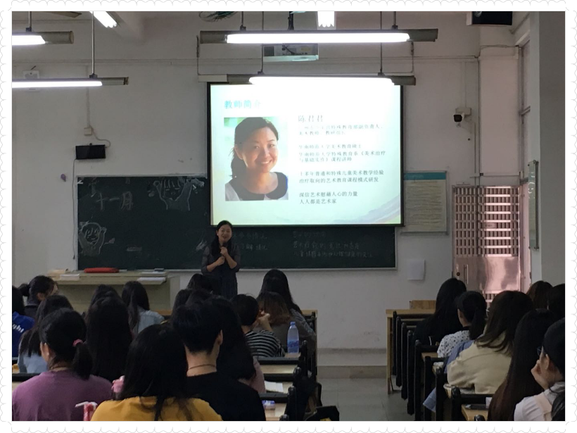 11月6日,广州市少年宫资深美术教师陈君君为我院学生带来了《美术治疗与儿童发展》讲座。陈老师通过美术体验活动带领学生领略了美术教育、美术治疗在一般与特殊儿童心理发展、审美教育上的积极作用和独特价值。进一步拓宽学生对幼儿教育的认识广度与深度。