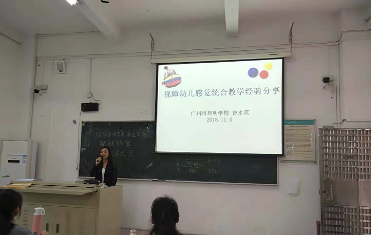 为更好的推进《特殊儿童感觉统合训练》课程作品化改革,优化利用校外专家资源优势,提高学生作品创作的实用性和可操作性,2018年11月4日上午,我们邀请了广州市启明学校幼教部特殊教育高级教师曾水英,与同学们分享了视障儿童感觉统合训练教学经验。