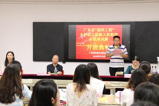 9月16日上午,由广东省教育厅主办,我校承办的2019年广东省乡村幼儿园新入职教师示范培训项目开班典礼及首次集中培训在我校燕岭校区图书馆美术实训室举行。华南师范大学教授扈中平、学前教育学院党总支书记孙志豪、肖少玲老师以及来自广东省清远、英德、揭阳等地近50名幼儿园老师出席了开班仪式。开班典礼由学前教育学院副院长颜雪梅主持。