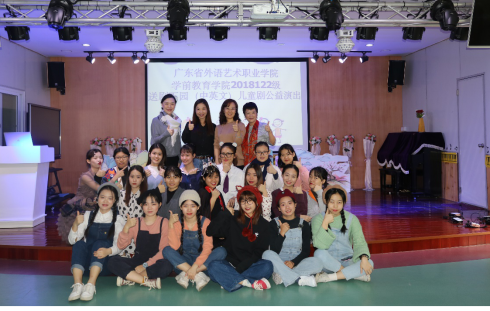 1月6号广东省外语外贸大学幼儿园音乐厅内,幼儿园教师和小朋友齐聚一堂。天真的笑脸,银铃般的笑声,稚嫩的掌声,烘托出热烈欢快的气氛。这里正在举行广东省外语艺术职业学院学前教育学院2018122级“送剧下园”公益演出活动。该活动是学前教育学院英语童话剧课程的延伸,也是尝试“校企共建、工学结合”的新途径。该课程在12月24日刚刚结束学期汇报,1月6日21位学生就在学院副院长郑娜、任课教师张燕的带领下,带着课堂上创作的儿童剧来到广外幼儿园,为全园270名小朋友进行表演,检验课程成果,对接岗位能力。