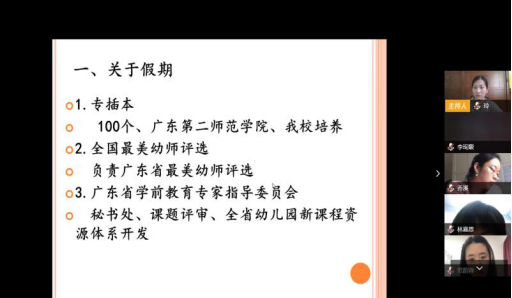 我院副院长颜雪梅结合《2020年春季学期疫情防控期间学前教育学院实训方案》和《2020年春节学期疫情防控期间学前教育学院顶岗实习任务说明与要求》对我院新学期学生见习、顶岗实习工作进行了说明。疫情期间,我院以幼儿教育资源库建设替代顶岗实习任务的方案,既保障了学生安全,又有利于学生专业能力和实践能力的提高。实训室建设和培训任务方面,她说,本学期我院将启动早教实训室改造工作,继续承接广东省幼儿园骨干教师能力提升研修和广东省民办幼儿园院长研修等培训项目。