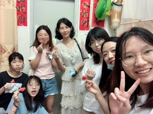 图:我院毕业班德育导师魏小娜给毕业生宿舍送西瓜、话家常