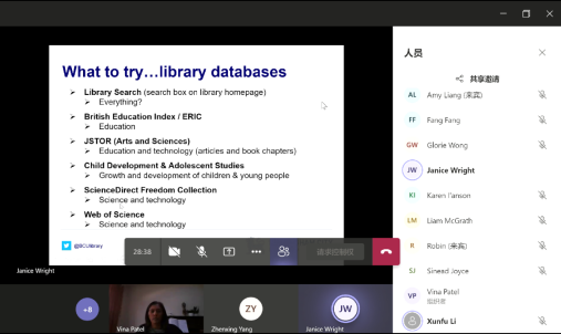 接着,BCU图书馆资深管理员珍妮斯·赖特(Janice Wright)利用幻灯片详细说明了我方师生如何快速查找及有效利用BCU学术资源以及如何及时寻求24小时在线帮助等。