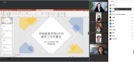 为持续优化教学教务工作,深化教学改革,促进专业和课程建设,学前教育学院于4月6日上午在腾讯会议召开了2021-2022学年第2学期教学工作月例会。学前教育学院副院长郑娜、专业带头人、教研室主任、试点学院项目办负责人及教学秘书出席了会议。会议由郑娜主持。