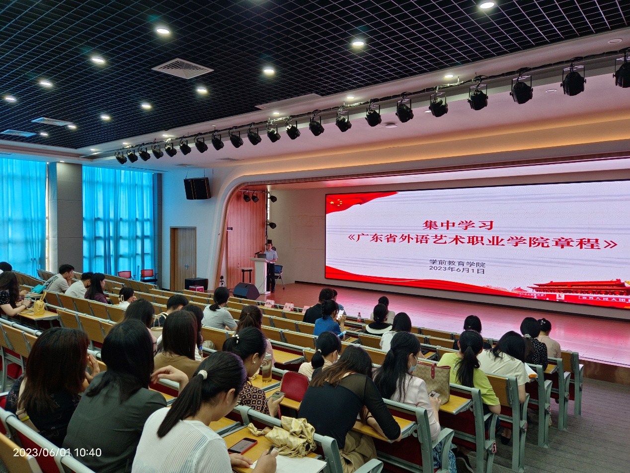 随后,与会人员开展《广东省外语艺术职业学院章程》(2022核准稿)集中学习。张武龙为全院教职工介绍了学校章程修订核准情况、章程基本框架及核心要义等内容,要求大家加强学习,在日常教学管理工作中做到合规合法,做学法、懂法、守法的“学前人”。会议还结合师德师风学习教育材料进行了深入学习和提醒,要求大家知敬畏守底线,做有理想信念、有道德情操、有扎实学识、有仁爱之心的“四有”好老师。