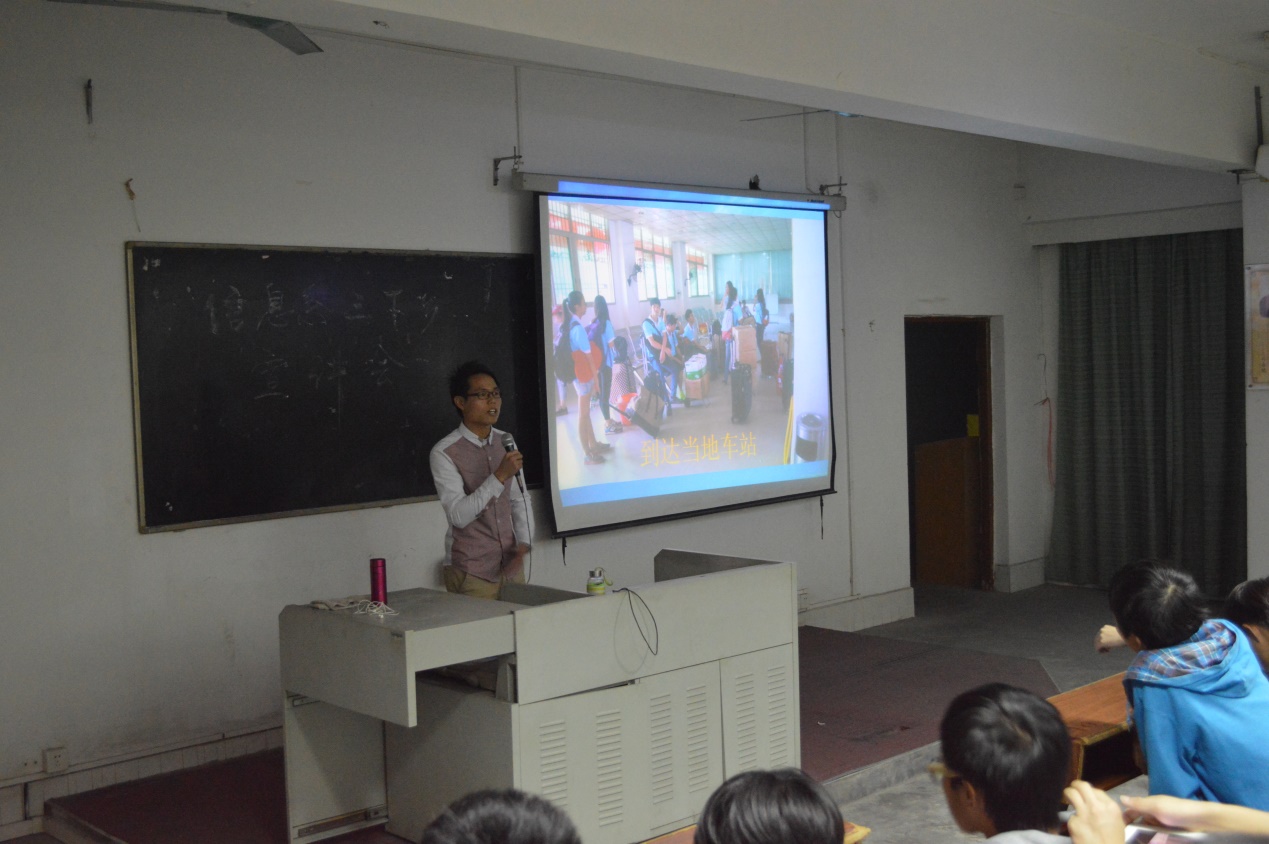 11月12日晚,信息技术系启铭队、科技队和织梦队三支支教队联办的“三下乡”支教暨公益服务宣讲大会于信息楼403举行。各支教队新老队长及14级全体新生出席本次宣讲会,各队新队长担任主讲。