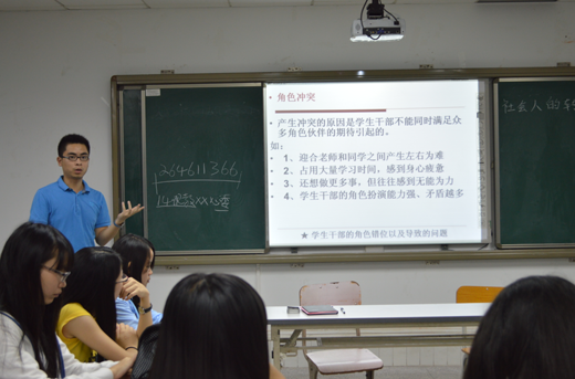 辅导员以“服务同学,锻炼自己”为切入点,引导所有轮训干部进入对“当好学生干部”的深层思考,强调学生干部首先是学生,要学会做人、加强学业学习,完成从“当一名学生”到“当一名优秀学生”到“当一名学生干部”再到“当一名优秀学生干部”角色升华,层层推进提升自己;学生干部是服务者、楷模,要注重群众基础,在学生群体中培养亲和力,对自己要有三种来自不同层面的自我要求:(对自己)要求提升自我价值,(对同学)加强服务与奉献意识,(对集体)提升自己的实践能力。同时,辅导员对学生干部提出“5有”要求:有热情、有自信心、有责任心、有目标、有方法,并表示希望各轮训干部成为一名品学兼优、能力出众的学生干部。历时近两个小时培训会不知不觉接近尾声,轮训干部表示获益良多、意犹未尽,期待举行下一场的培训。