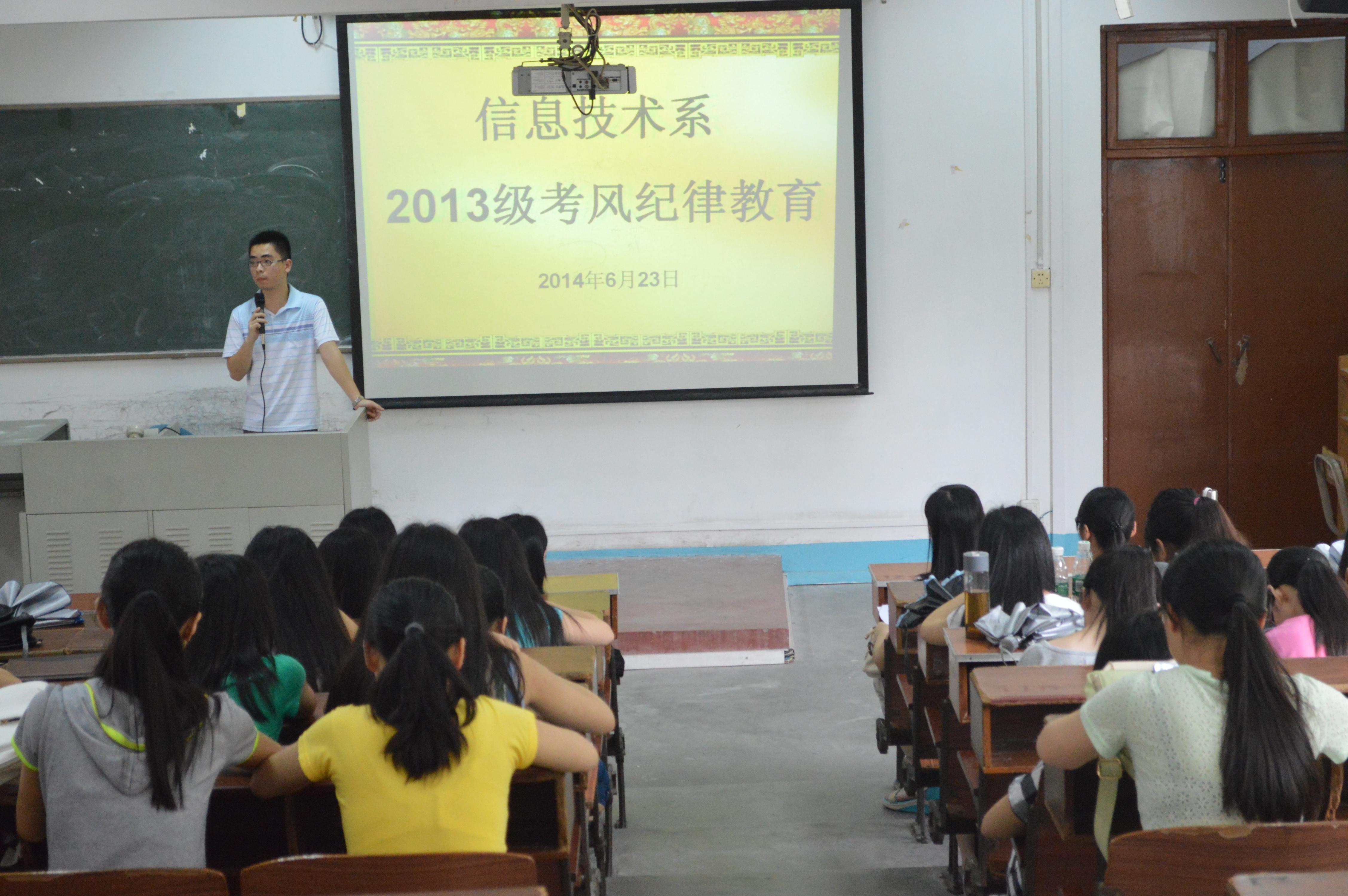 为做好学生考风考纪教育,教育引导学生端正考试态度,6月23日下午,由我系新生辅导员马培豪老师主持的2013级学生考前考风考纪教育大会在信息楼303召开。