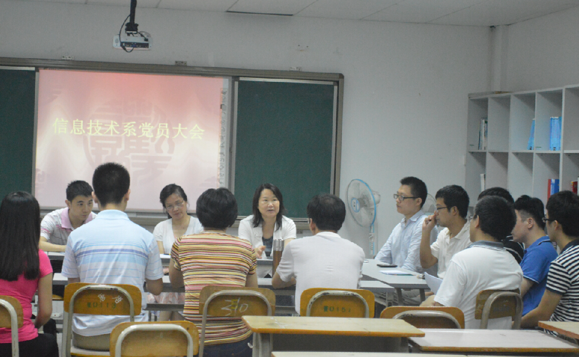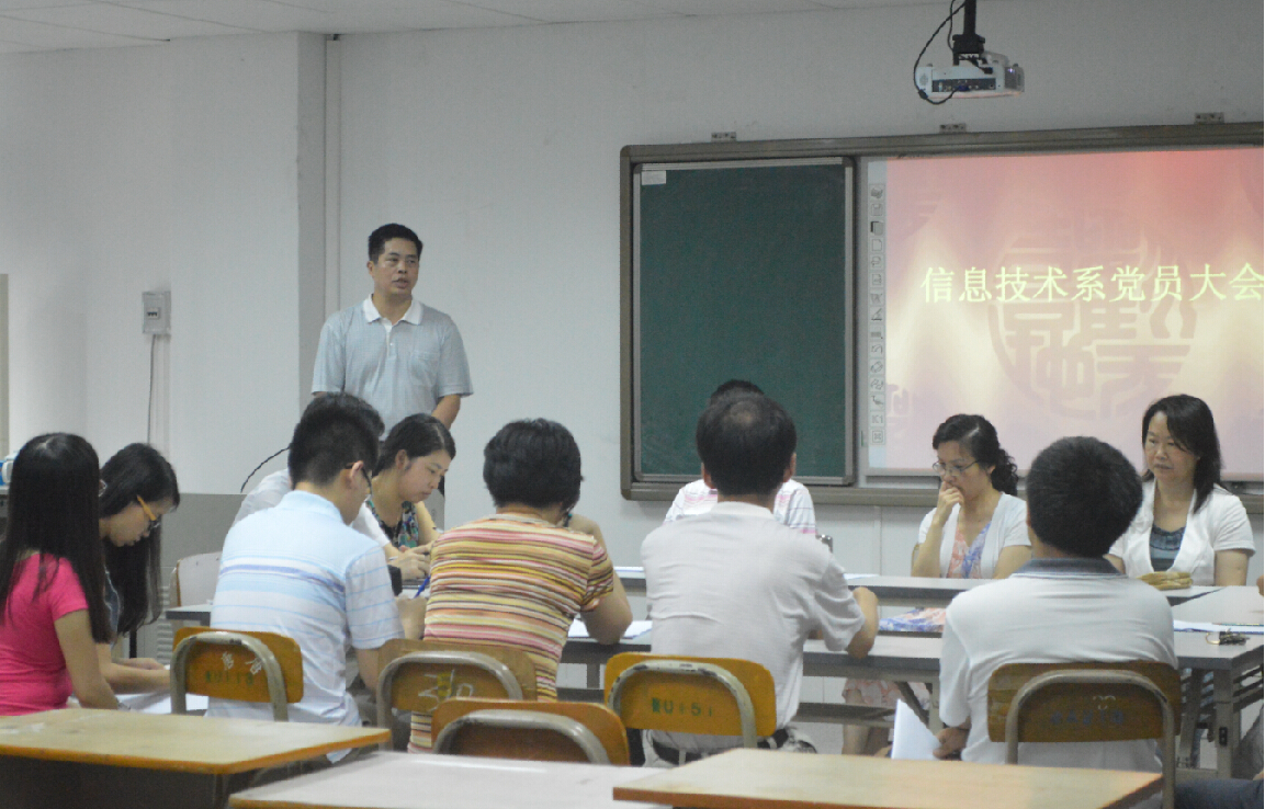信息技术系党支部为选举新一任系部书记,2014年7月2日下午,于信息楼304召开信息系党支部大会。学院党委书记卢羡文、信息系党支部书记邓秋萍等13位师生党员以及3位预备党员全体参加了本次大会。