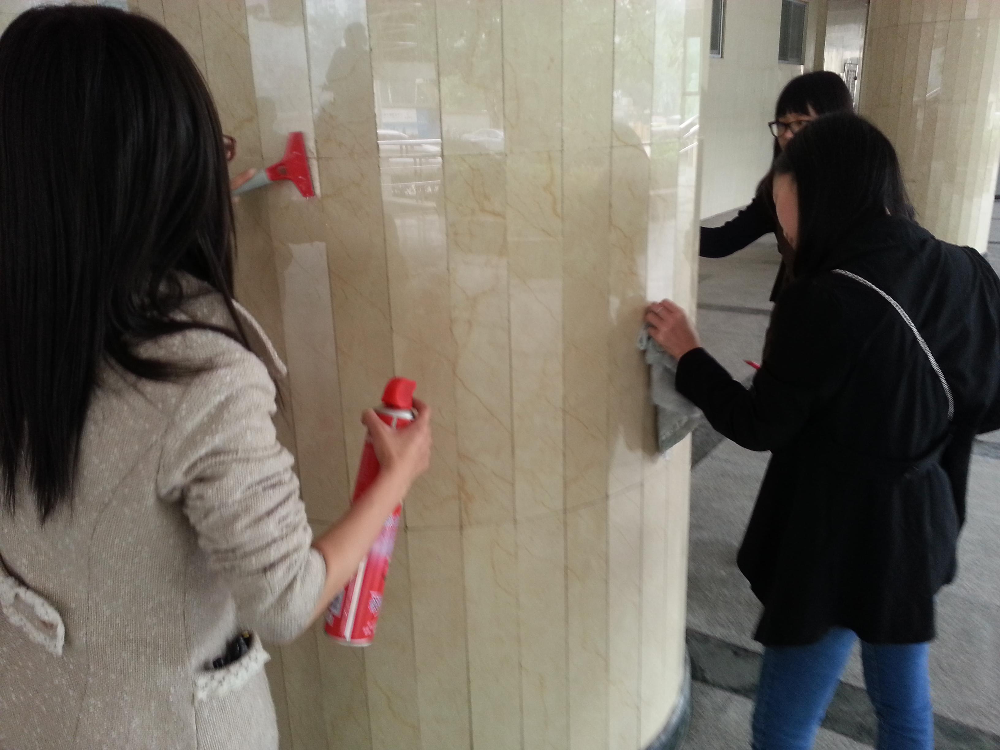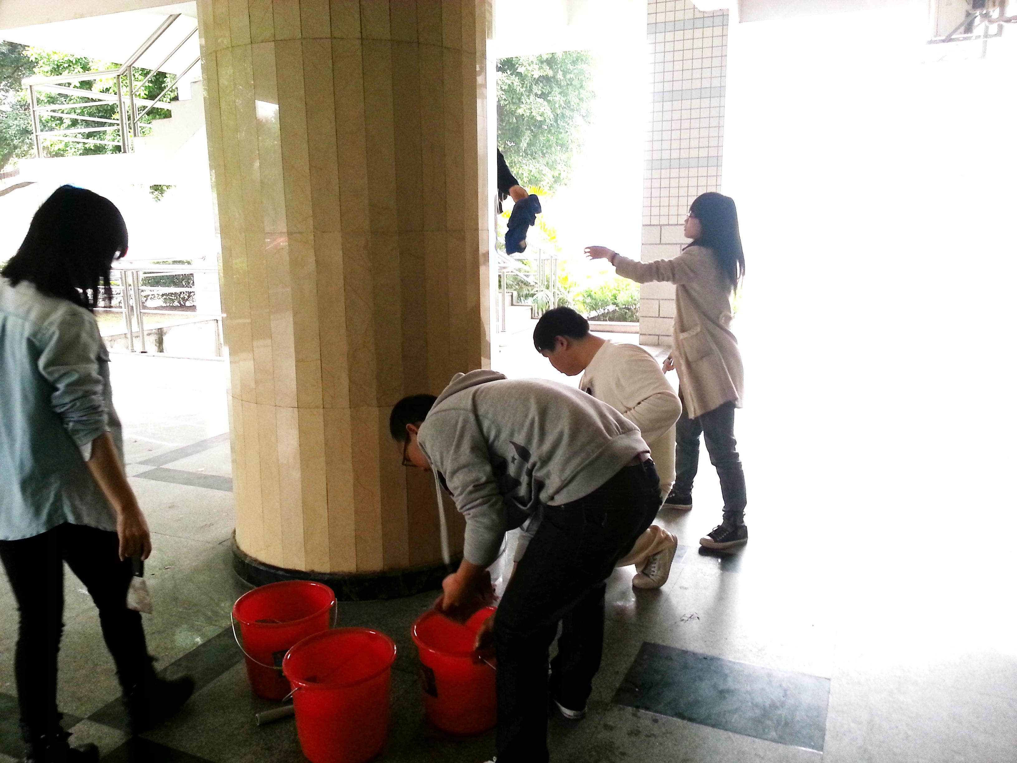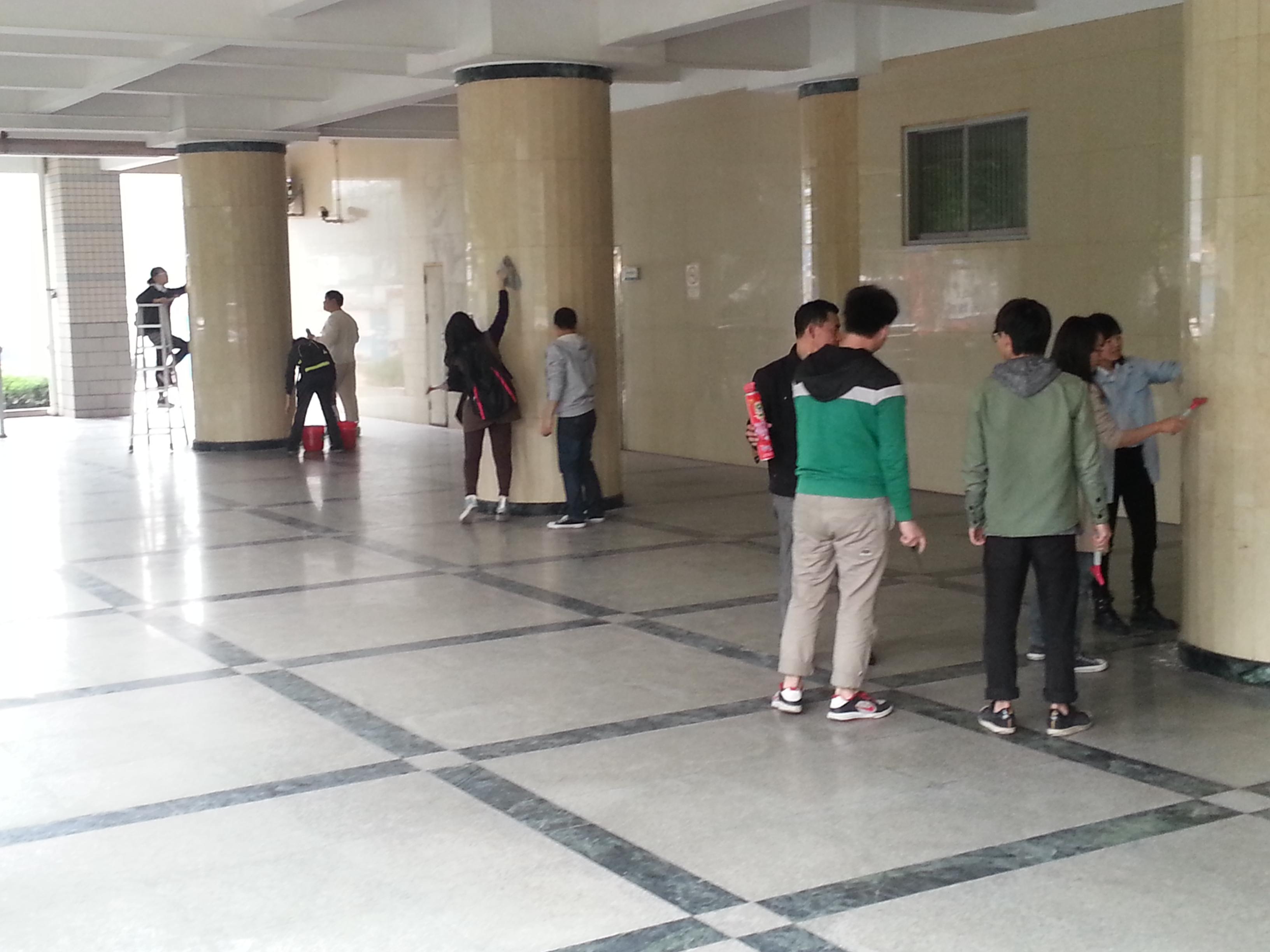 从学校后勤处借来打扫所需的工具后,分团委学生会的学生干部们经过后勤集团伍经理的指导,纷纷拿起工具开始对综合楼下大堂的柱子、墙壁进行清理。男生们拿着水桶去提水,女生们便拿起铲刀和去污粉对柱子、墙壁上的不干胶痕迹进行清除。对于较高地方的污迹,男生们便借来梯子,爬上去进行清理,再用湿抹布擦干净。整个清扫过程中信息系团学干部们认真卖力,配合默契,最终顺利、圆满地完成了此次清扫活动。