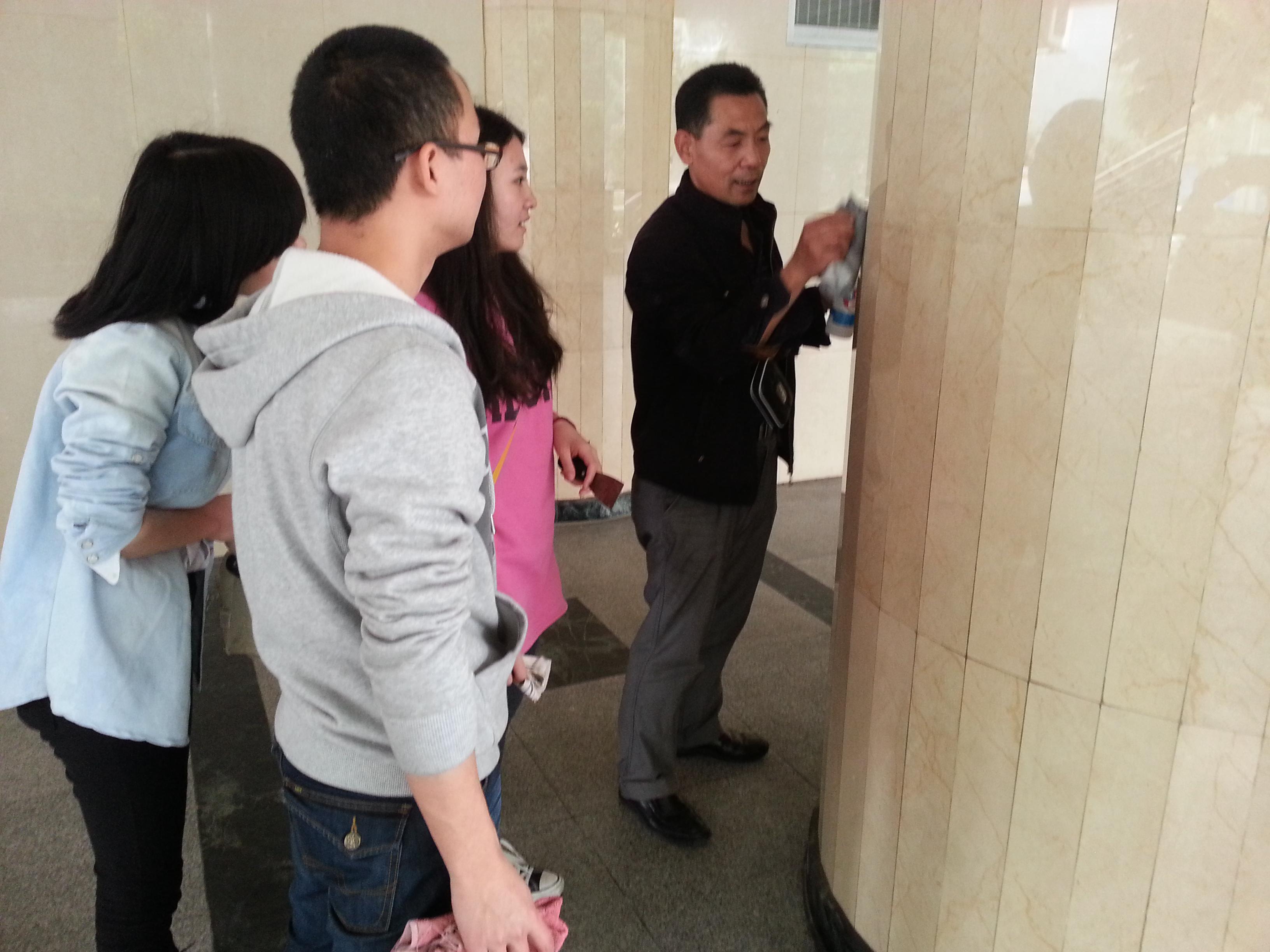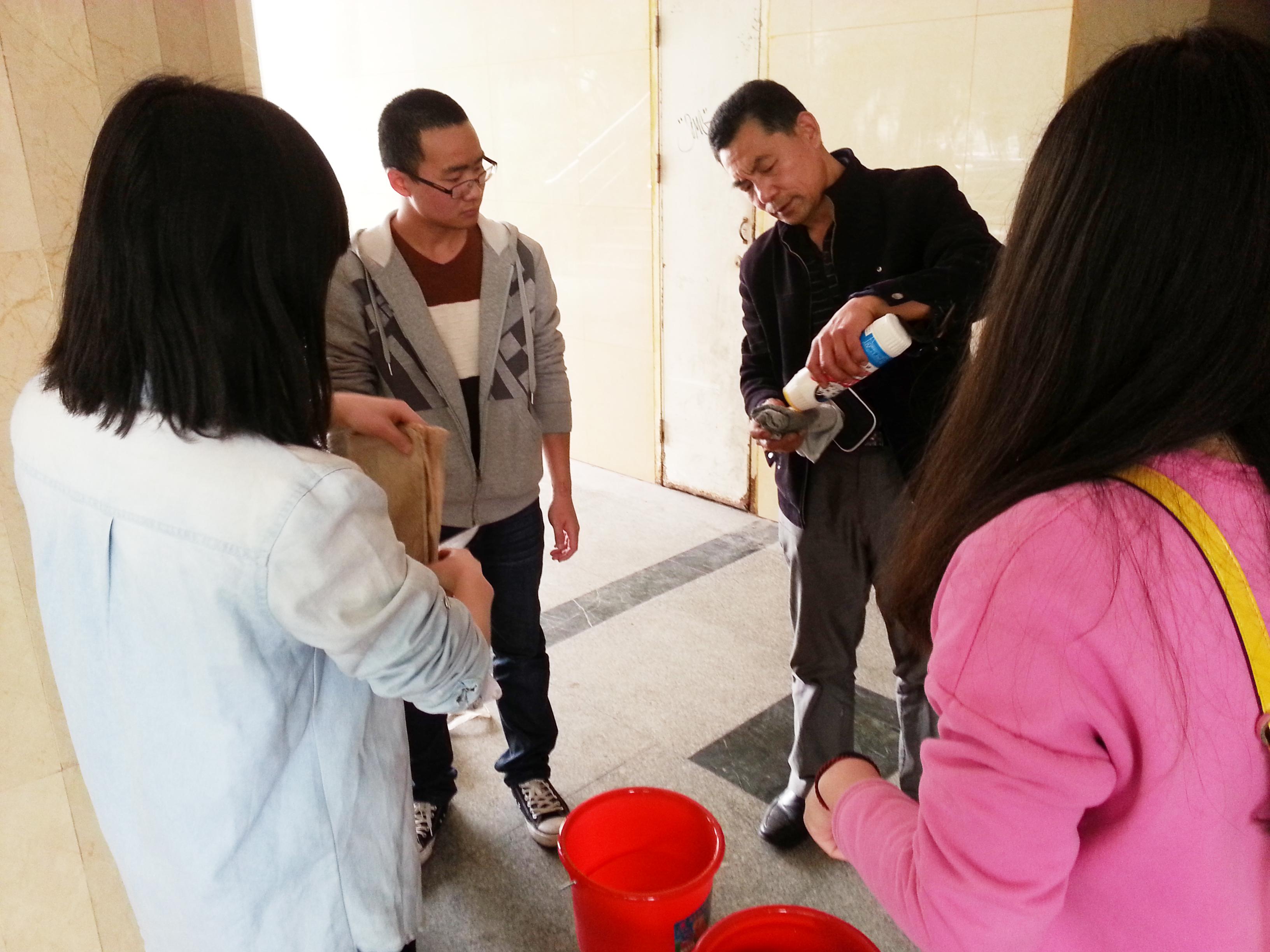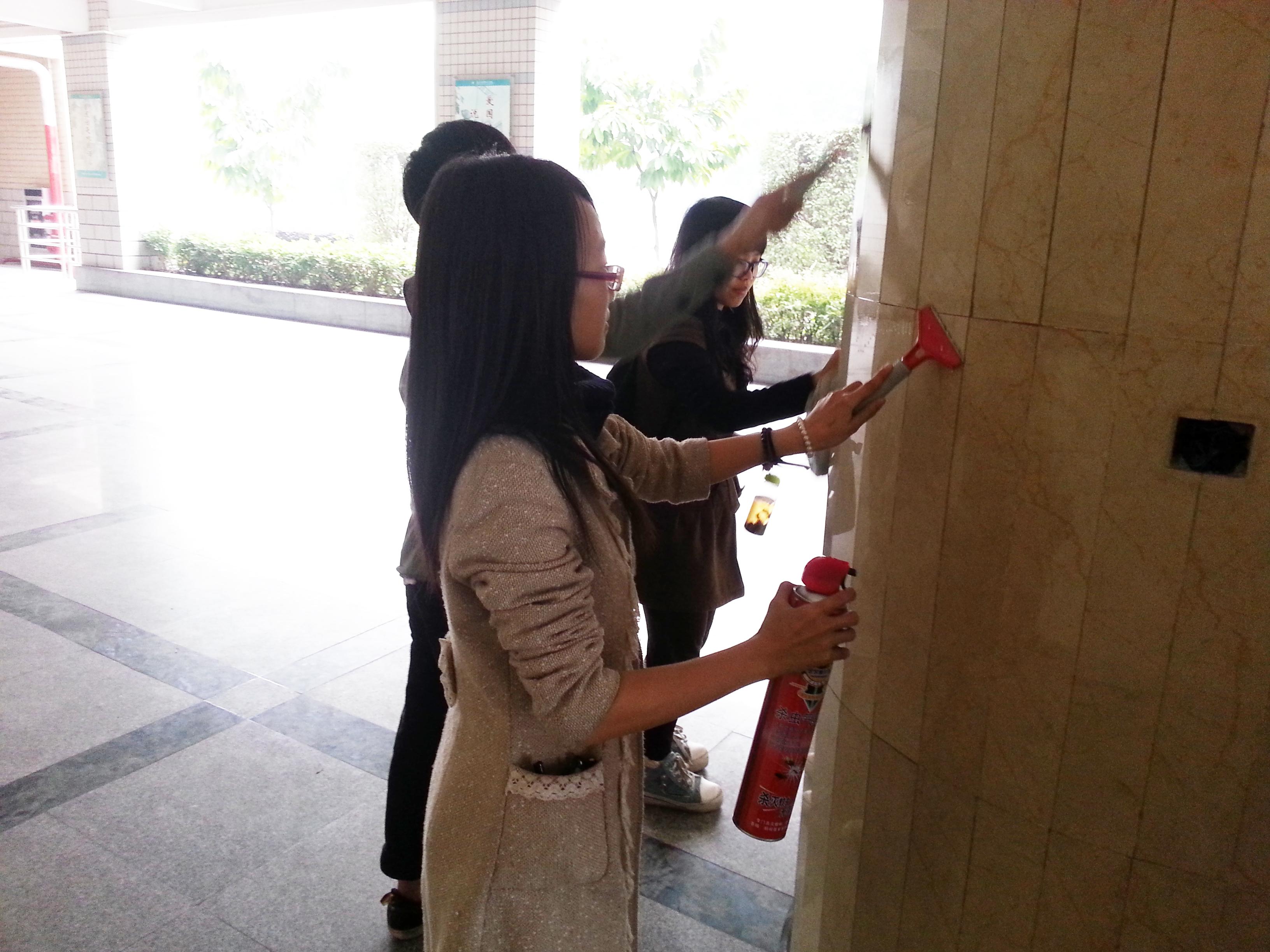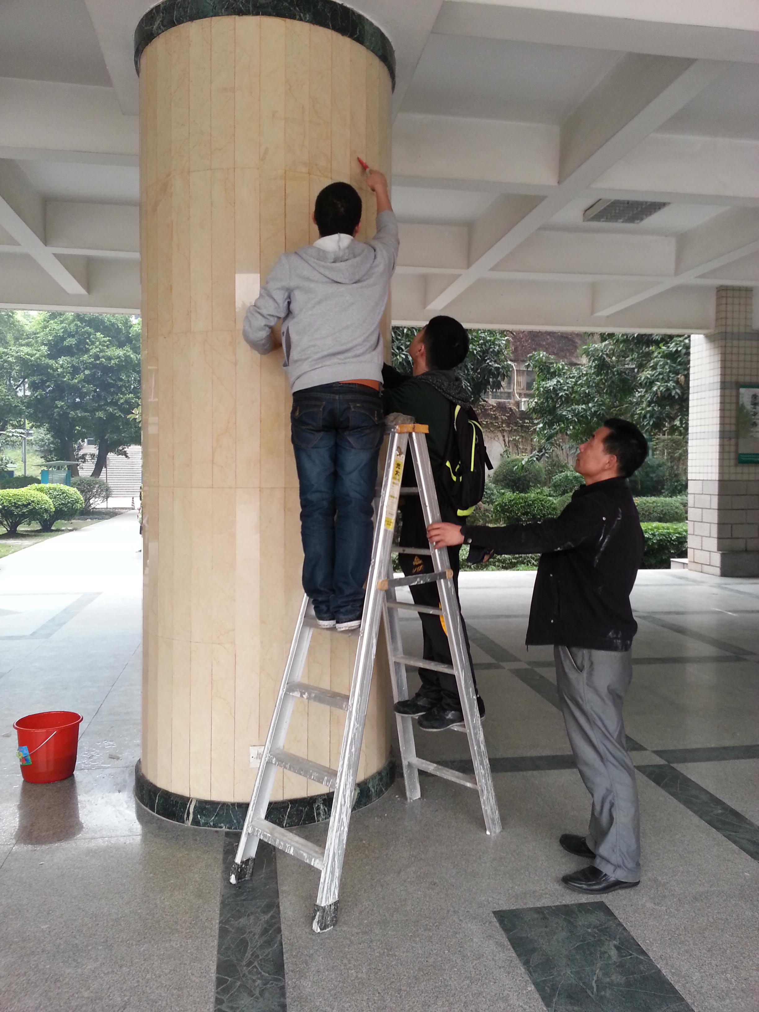 从学校后勤处借来打扫所需的工具后,分团委学生会的学生干部们经过后勤集团伍经理的指导,纷纷拿起工具开始对综合楼下大堂的柱子、墙壁进行清理。男生们拿着水桶去提水,女生们便拿起铲刀和去污粉对柱子、墙壁上的不干胶痕迹进行清除。对于较高地方的污迹,男生们便借来梯子,爬上去进行清理,再用湿抹布擦干净。整个清扫过程中信息系团学干部们认真卖力,配合默契,最终顺利、圆满地完成了此次清扫活动。