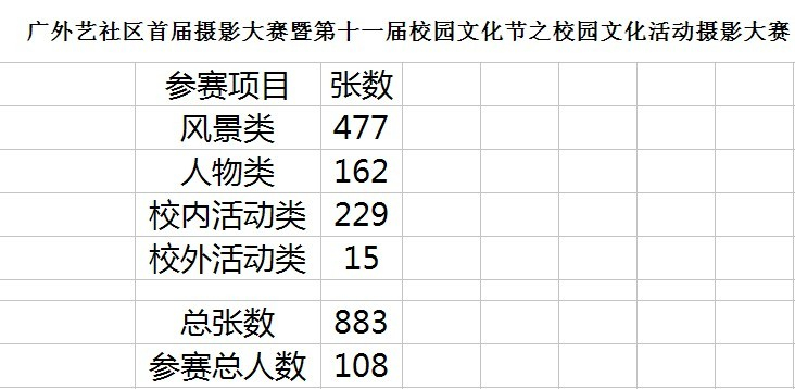最终,经过大赛工作人员两天时间的收集作品与整理统计工作之后,共有106位参赛者参加了此次比赛,收集到的作品有883个,其中风景类477个,人物类162个,校内活动类229个,校外活动类15个。