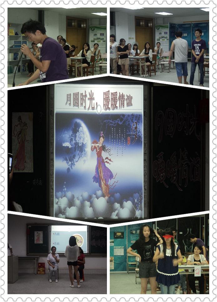 晚会前,班委群策群力、精心策划、认真准备,例如布置教室、采购月饼、糖果等,分工有序。此次活动由杨单滟、伍靖文同学主持,张苗苗、周晓玲同学担任晚会的游戏裁判。活动第一部分是“疯狂猜歌王”,把同学们分成两组进行PK,女孩子们不再顾及自己的优雅淑女形象,跟男同学进行激烈的PK,经过同学们的努力抢答后分出了胜负。虽然这个环节只是一个开场,却把整个活动的气氛都带入了高潮第二部分是“手舞足蹈”,由两组分别进行,大家都有很高的默契度,因此,大家都玩得很尽兴。第三部分是“观看视频”,由李俊晓同学为我们讲解中秋节的历史来源,与此同时,两位主持人也在准备下一个环节,场面温馨。紧接着,就到了同学们玩得最激烈的一部分——“踩地雷”,这需要两个人都有较强的方向感,很敏锐的反应能力。一环接一环,除此,还有“到底几只脚”,“猜灯谜”等游戏。