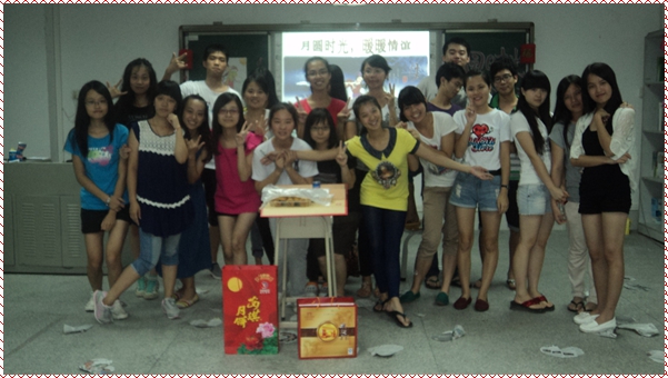 清风明月夜,共叙现教情。2013年9月16日晚上,信息技术系2012级现代教育技术2班在信息楼304举行了主题为“月圆时光,暖暖情谊”的中秋晚会。参加此次活动有德育老师杨雪柳老师、助班刘吴嘉敏师姐以及现教2班的全体同学。